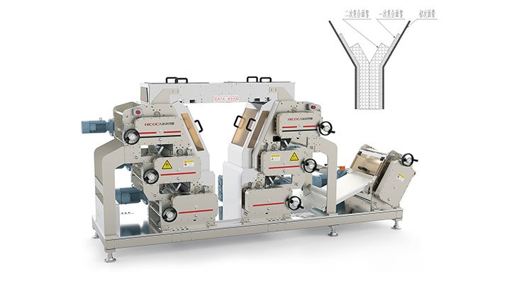 ◆ 面帶經過連續壓延輥壓成細密的、達到規定厚度要求的薄面片,形成更為完善的面筋網絡,面帶水分分布更加均勻,面帶具有一定的韌性和強度。